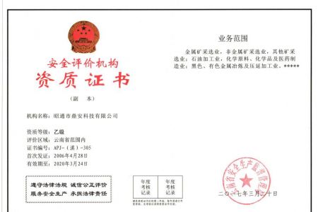2003年11月10日,昭通市鼎安科技有限公司成立,初始主要從事第三方安全工程技術(shù)服務(wù),經(jīng)多年運營,發(fā)展為多專業(yè)綜合科技平臺,為社會提供多種專業(yè)技術(shù)服務(wù)工作。 現(xiàn)公司注冊資金為1200萬元,公司法定代表人:毛衛(wèi)旭。公司主要業(yè)務(wù):安全評價、安全標(biāo)準(zhǔn)化評審、安全工程技術(shù)服務(wù);環(huán)境監(jiān)測、職業(yè)衛(wèi)生檢測、檢驗;法律訴訟及非訴訟服務(wù);司法鑒定、固定資產(chǎn)投資項目節(jié)能服務(wù);工程咨詢;工程測量測繪;安全教育培訓(xùn)等。是安全生產(chǎn)服務(wù)、安全教育培訓(xùn)機構(gòu),也是環(huán)境監(jiān)測和職業(yè)衛(wèi)生服務(wù)機構(gòu),同時也是綜合的檢測檢驗、綜合科技平臺服務(wù)機構(gòu)。多年來為公、檢、法、司、軍、警、海關(guān)、仲裁、安監(jiān)、工礦商貿(mào)企業(yè)、社會團體及個人提供多專業(yè)技術(shù)服務(wù)。